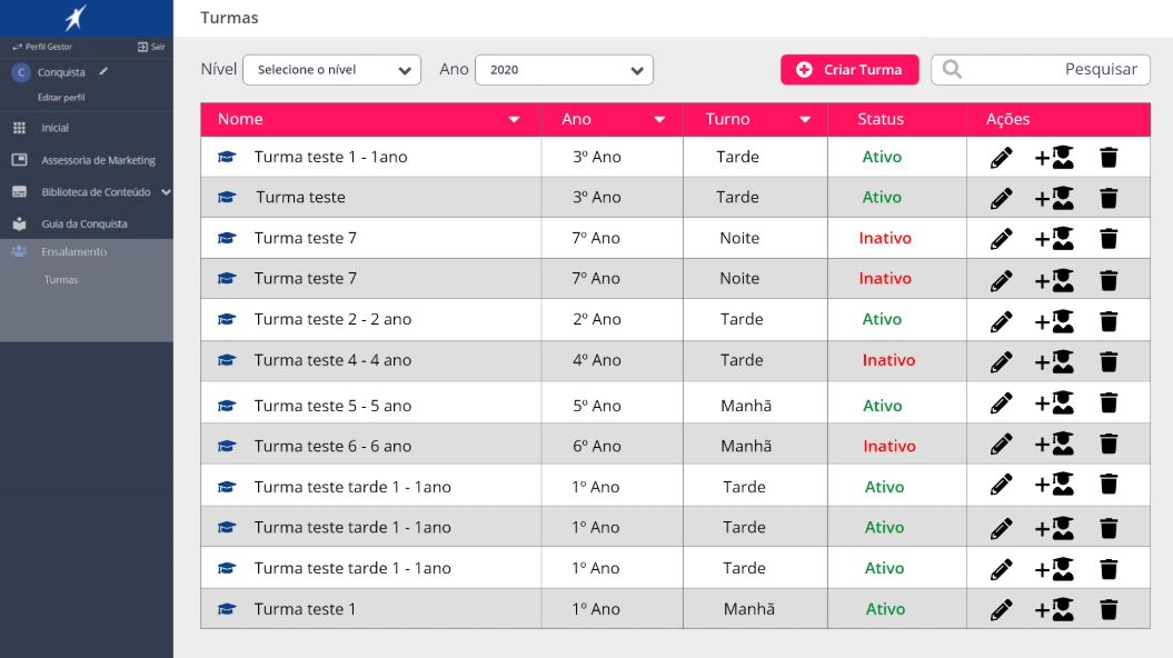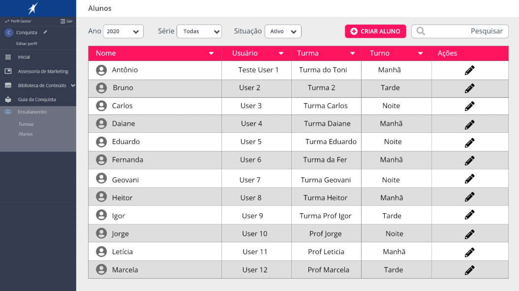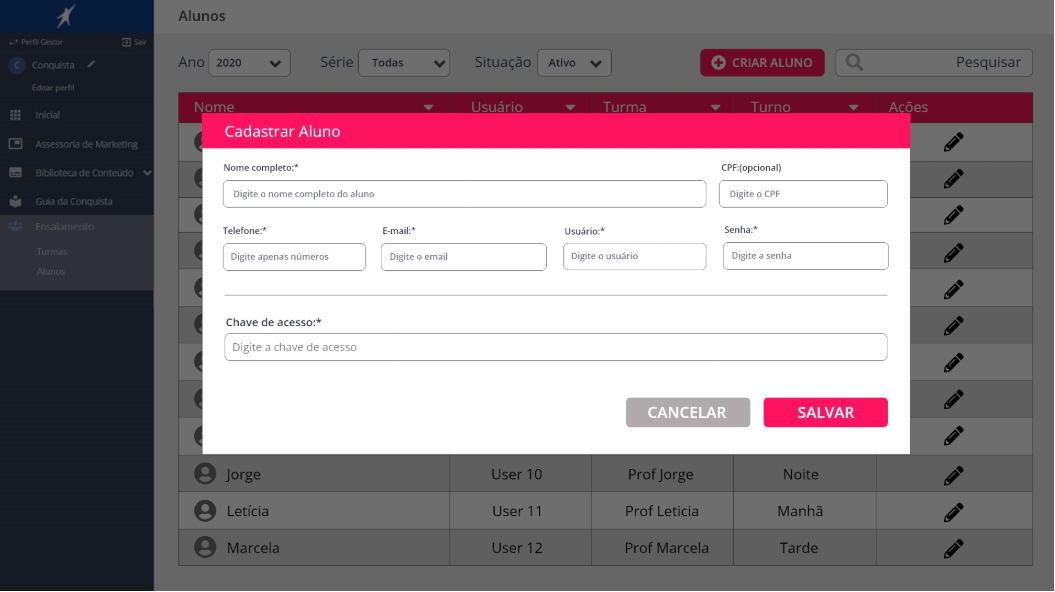 Improve the Portal Conquista experience by simplifying the student enrollment (“ensalamento”) process, making it faster and easier for school managers to create classes and register teachers and students. Additionally, enhance the platform’s usability to provide families with a clearer and more engaging way to follow students’ academic progress, transforming the portal into a more intuitive and supportive educational experience beyond simply viewing grades.